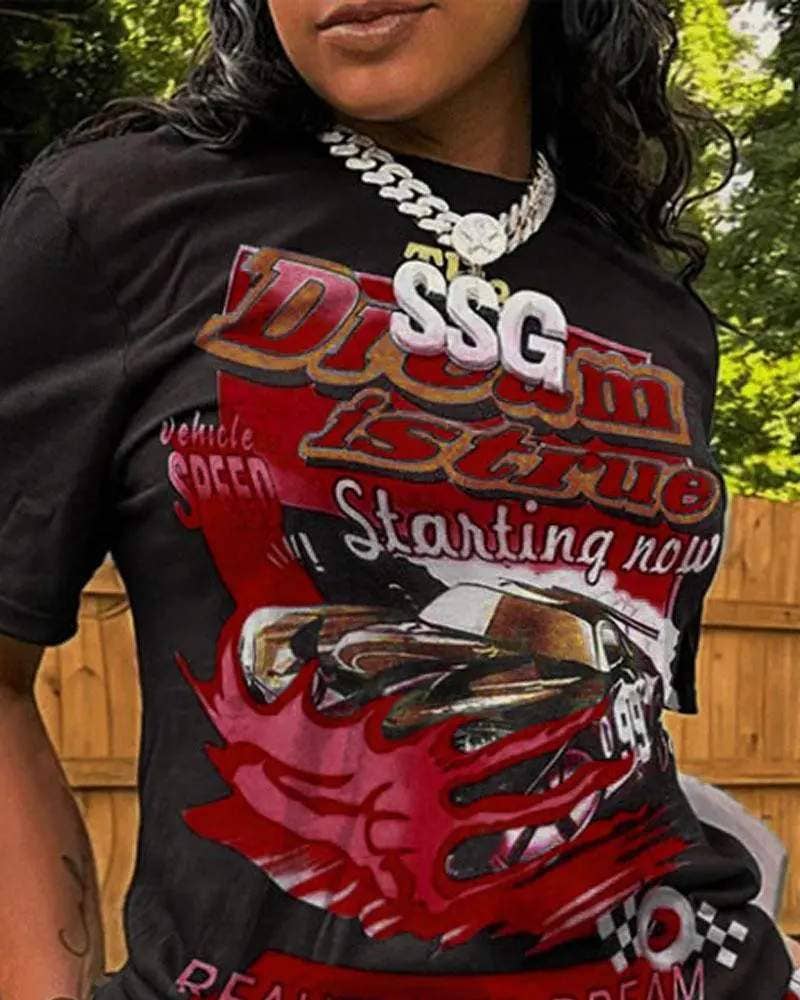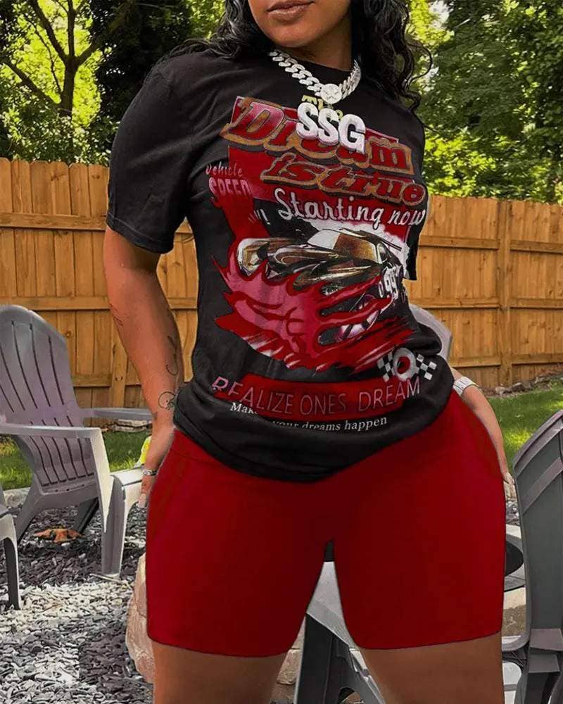 plus size the dream is true graphic print casual top shorts set style: basics,casual type: shorts set material: polyester neckline: o-neck sleeve style: short sleeve length: above knee pattern type: graphic,letter fit type: regular occasion: daily