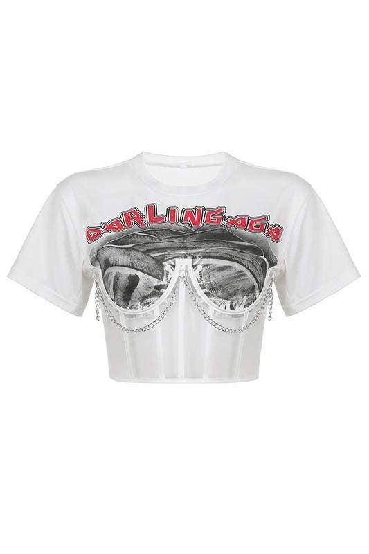 short sleeve mixed material fashion shirt, mesh corset chain tee shirt