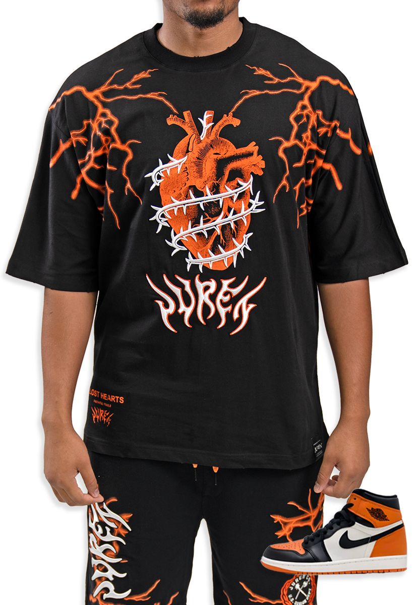 Juren Lost Hearts Black Shirt features a striking graphic design with an orange heart encircled by white barbed wire, surrounded by electric orange lightning bolts. This bold statement piece combines edgy symbolism with high-impact visuals, perfect for those who embrace unconventional style. The contrast between the vibrant orange accents and classic black backdrop creates an eye-catching look that stands out. Ideal for expressing your unique personality and attitude.