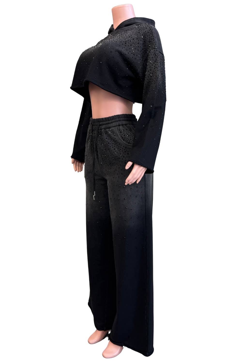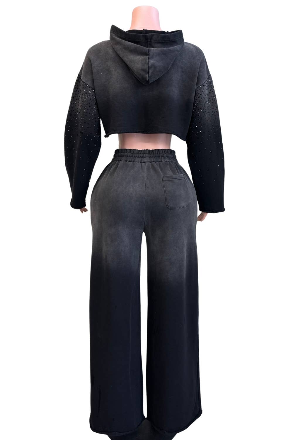 Two-piece lounge set featuring a hoodie top and wide-leg pants, designed with a grey-to-black ombre effect and embellished with scattered rhinestones for a sparkling finish.