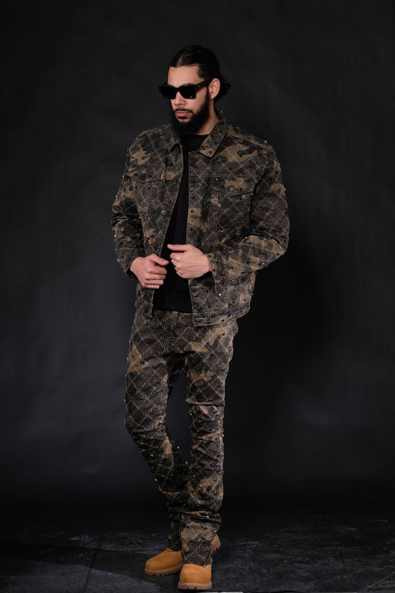 Elevate your streetwear game with this striking denim camouflage jacket, where rugged style meets high-fashion edge. Black rhinestones cascade across the fabric, catching light with every move and transforming a classic silhouette into a statement piece. The camo pattern adds urban attitude while the embellished detailing delivers that premium, eye-catching appeal your wardrobe demands. Perfect for layering over tees or hoodies, this jacket bridges casual and bold—ideal for anyone who refuses to blend in.